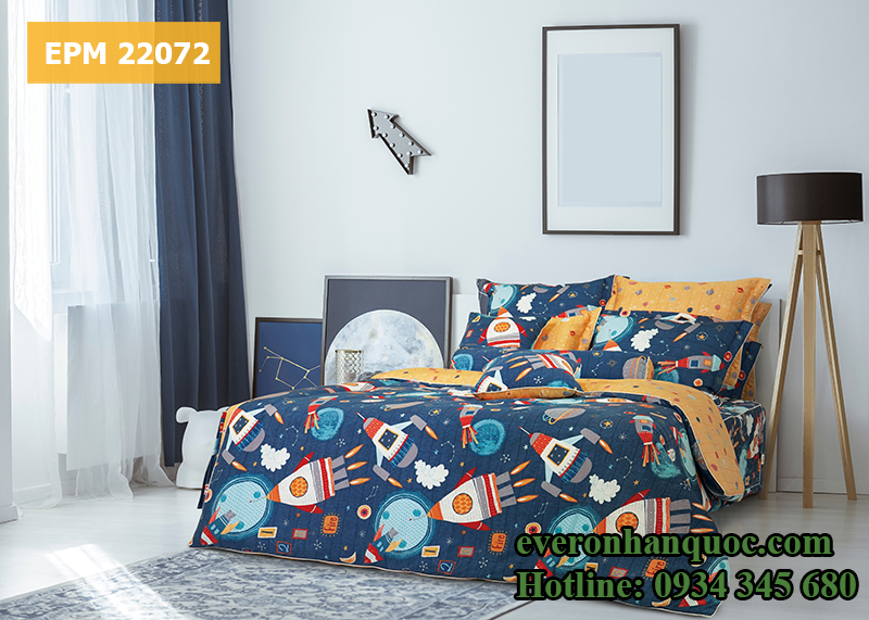 Bộ chăn ga EPM22072 được lấy cảm hứng từ vũ trụ mênh mông rộng lớn, nơi mà mọi hành tinh đều kết nối với nhau, tạo nên một dài ngân hà tươi đẹp. EPM22072 vẽ lên hình ảnh tàu vũ trụ, các chùm sao, các hành tinh giữa nền vải màu xanh than như bầu trời đêm đầy màu sắc. Đối lập với mặt ngoài, mặt trong chăn sử dụng gam màu be sáng, tô điểm thêm những tiểu hành tinh nhỏ bay lượn. Bộ chăn ga như phác họa lại trí tưởng tượng phong phú của trẻ thơ về một thế giới rộng lớn, , thúc đẩy niềm yêu thích của bé với thiên nhiên và tạo sự thích thú cho bé khi chìm vào giấc ngủ.