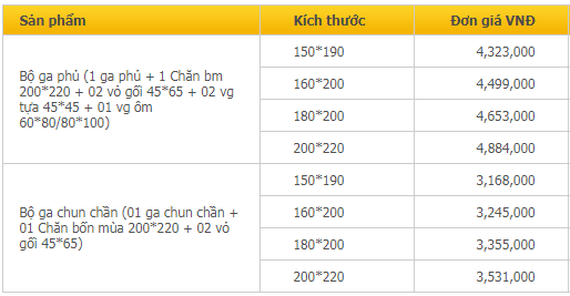 BẢNG GIÁ BỘ CHĂN GA GỐI ES1841