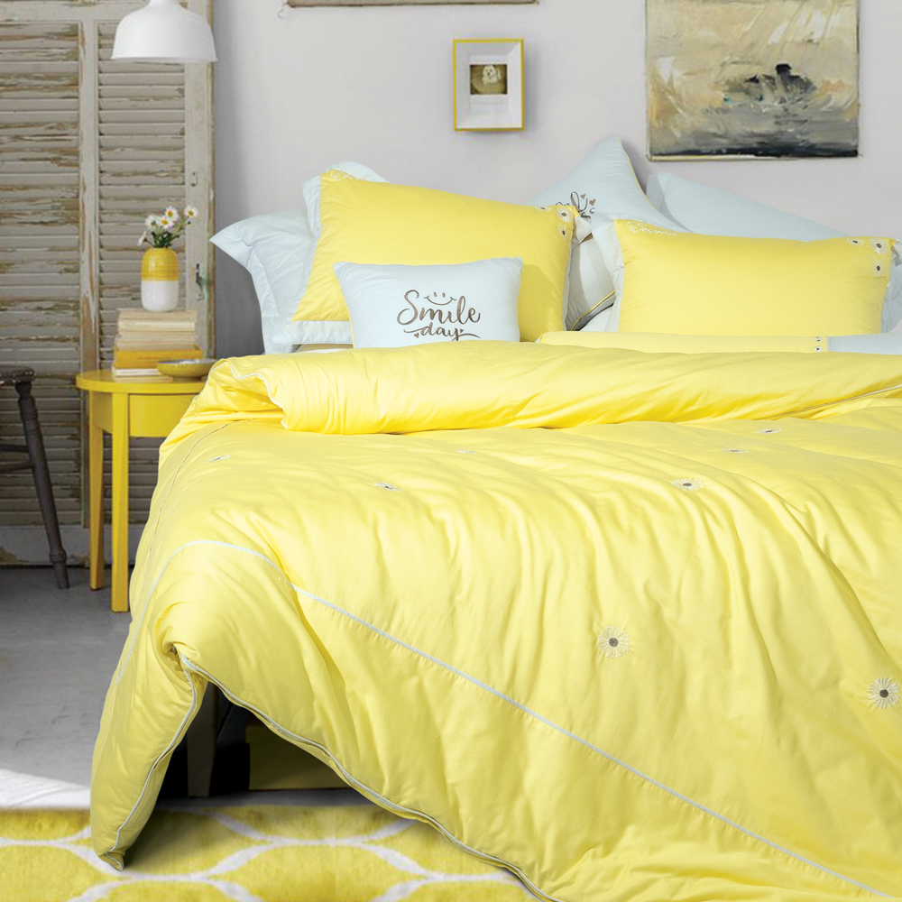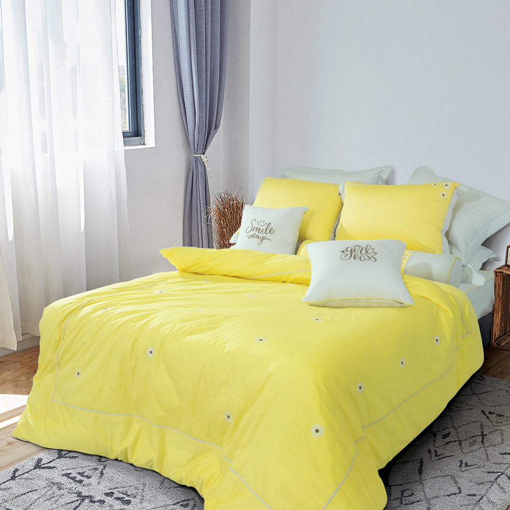 ESC22003 là bộ chăn ga dành cho những cô nàng năng động, trẻ trung và luôn yêu đời, yêu cuộc sống. Gam màu chủ đạo của bộ chăn ga là màu vàng tươi của nắng, điểm thêm một vài bông hoa cúc nhỏ xinh rất nổi bật và tươi trẻ. Chất liệu vải Cotton mềm mại, láng bóng sẽ cho bạn một giấc ngủ ngon trọn vẹn. Thêm vào đó, slogan “Girl boss” và “Smile Day” sẽ là động lực, sự cổ vũ cho ngày mới của bạn luôn tràn đầy năng lượng tích cực, vui tươi.