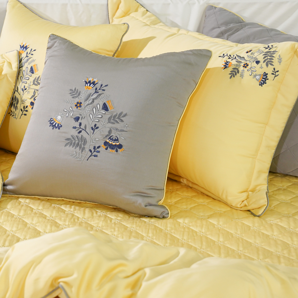 EST22031 là sự kết hợp hài hòa giữa màu vàng và màu ghi, rất trẻ trung và hiện đại. Nếu màu vàng là biểu tượng của sự ấm áp, chan hòa, thì màu ghi lại là một gam màu trung tính, là bổ trợ hoàn hảo tôn thêm vẻ đẹp của bộ chăn ga. Điểm xuyết trên nền vàng là những chùm hoa đồng nội đang vươn lên như hướng tới ánh sáng mặt trời. Bộ chăn ga EST22031 sử dụng chất liệu vải Tencel cao cấp mềm mại, mát mẻ, cùng thiết kế đặc biệt mang đến cảm giác thoải mái, tươi tắn đón chào một ngày mới.