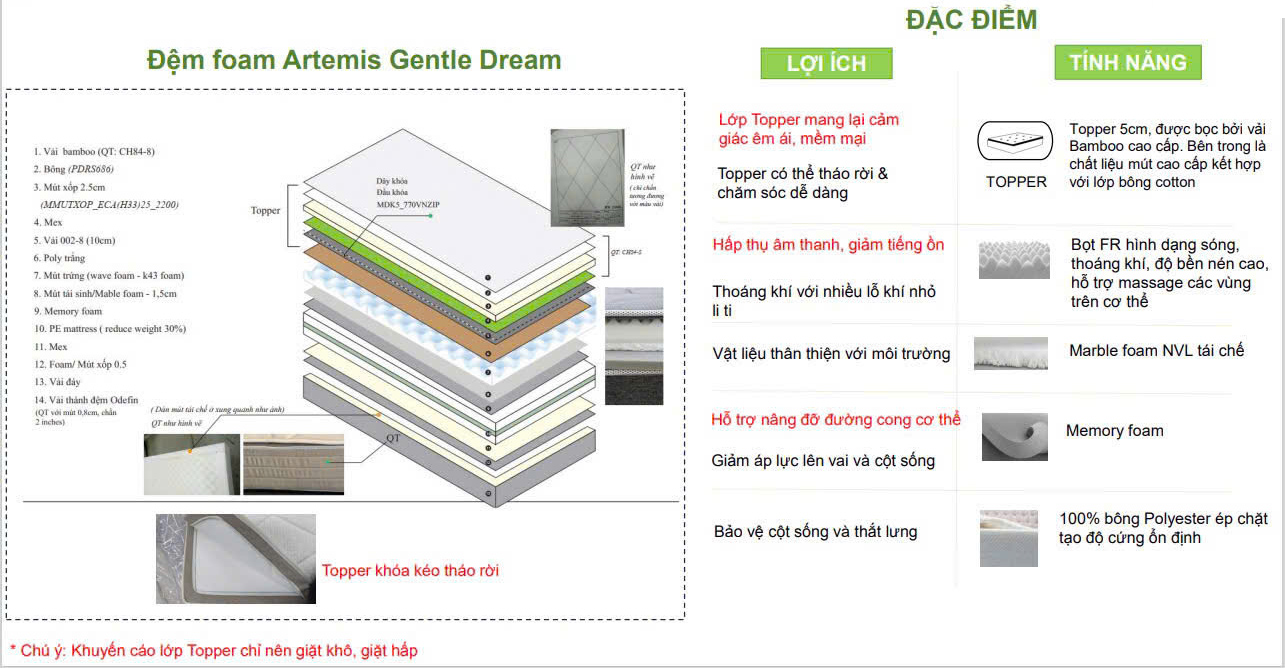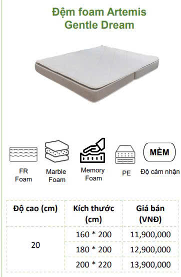 Với 150 lớp bông ép cốt lõi, đệm foam Artemis Gentle Dream giúp giảm áp lực lên cột sống, phân tán lực hiệu quả.Cấu tạo đệm được bổ sung lớp hấp thụ âm thanh đặc biệt, không làm gián đoạn giấc ngủ bởi các tiếng ồn chuyển động trên bề mặt đệm.