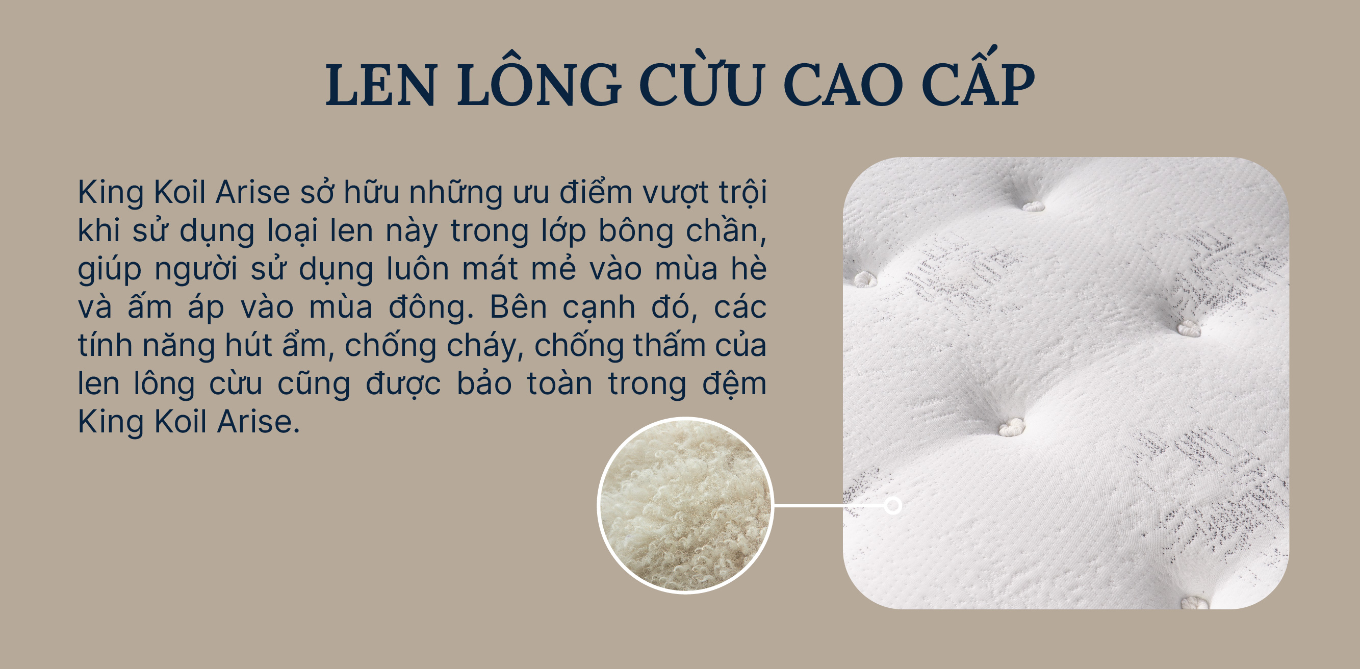 Với tính chất dẻo dai và đàn hồi cao đặc trưng của len lông cừu, người nằm luôn cảm thấy mát mẻ vào mùa hè và ấm áp vào mùa đông, đồng thời đảm bảo các tính năng hút ẩm, chống cháy, chống thấm