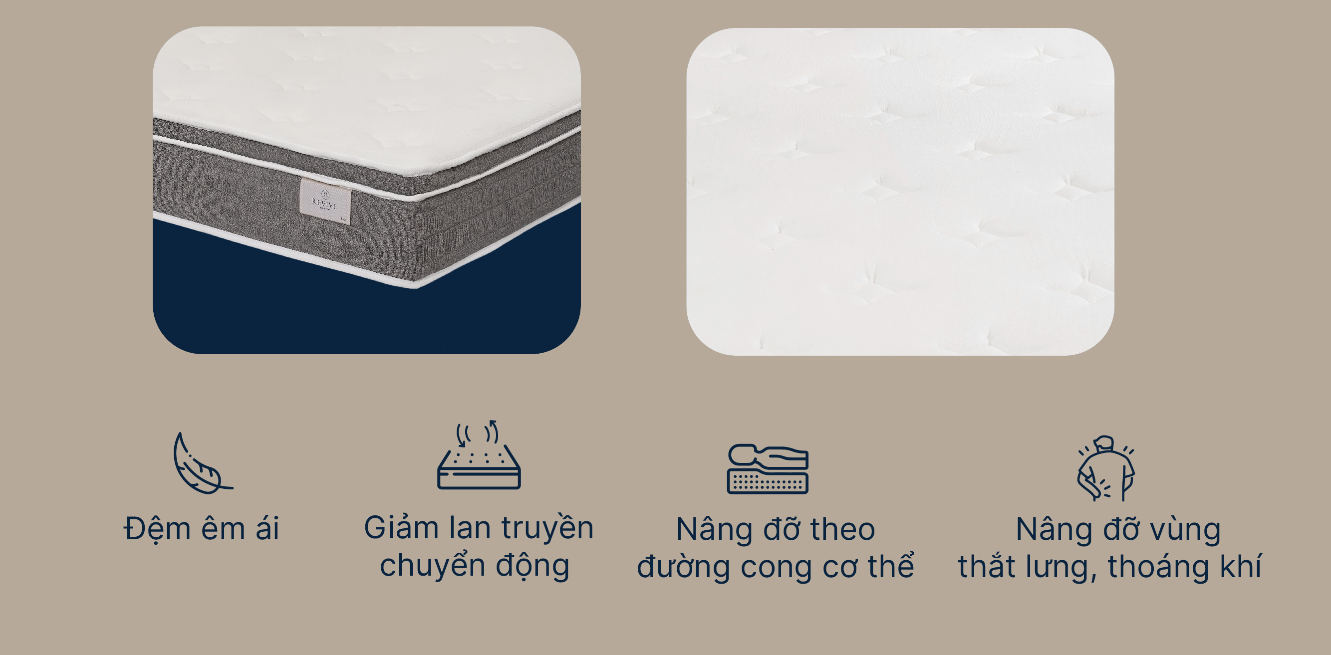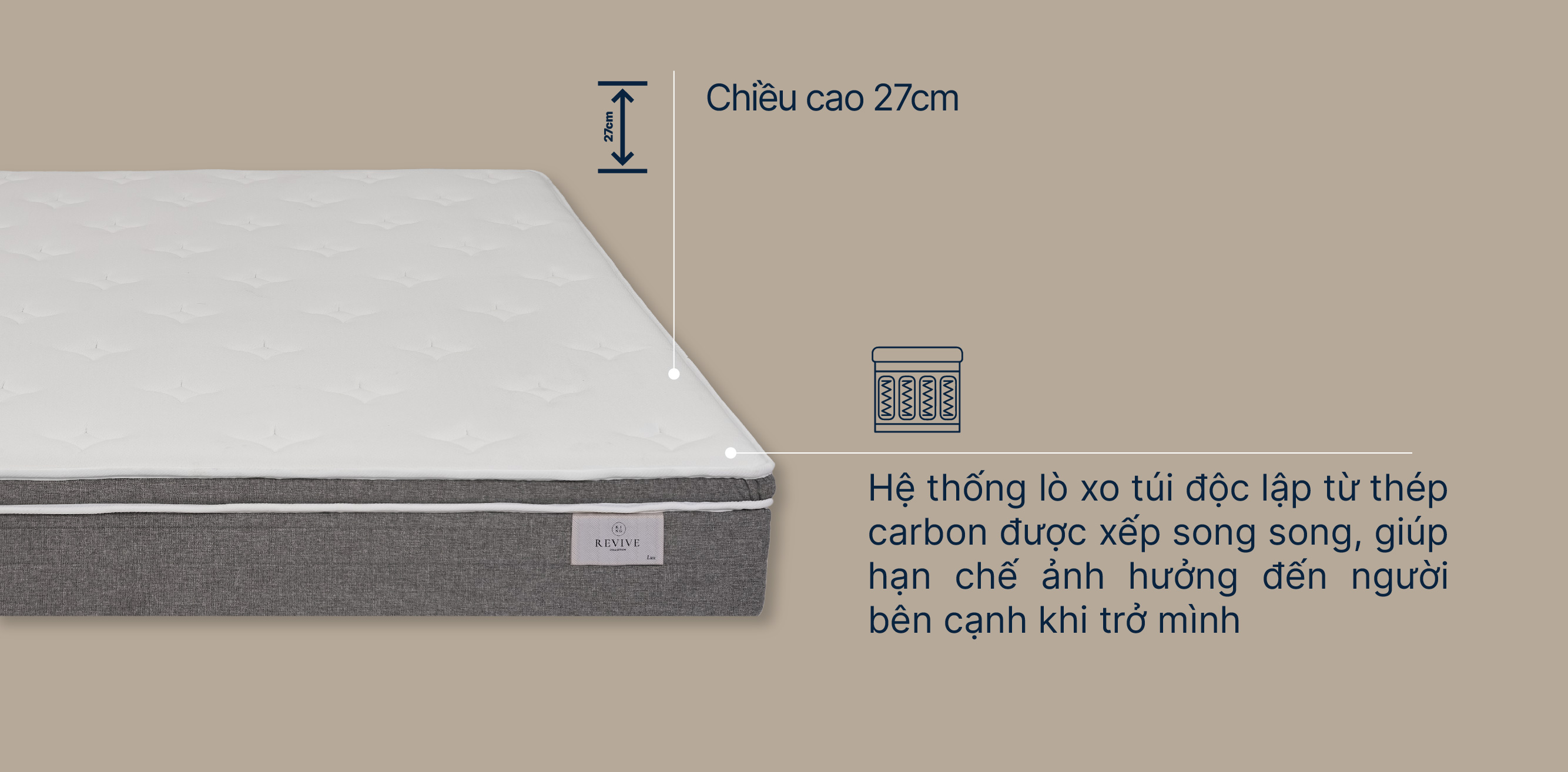 Hệ thống lò xo túi độc lập dạng thấp nâng đỡ tối ưu từng vùng cơ thể. Các cuộn lò xo được bọc trong túi vải riêng biệt hạn chế tối đa tiếng động va chạm giữa các thanh lò xo.
