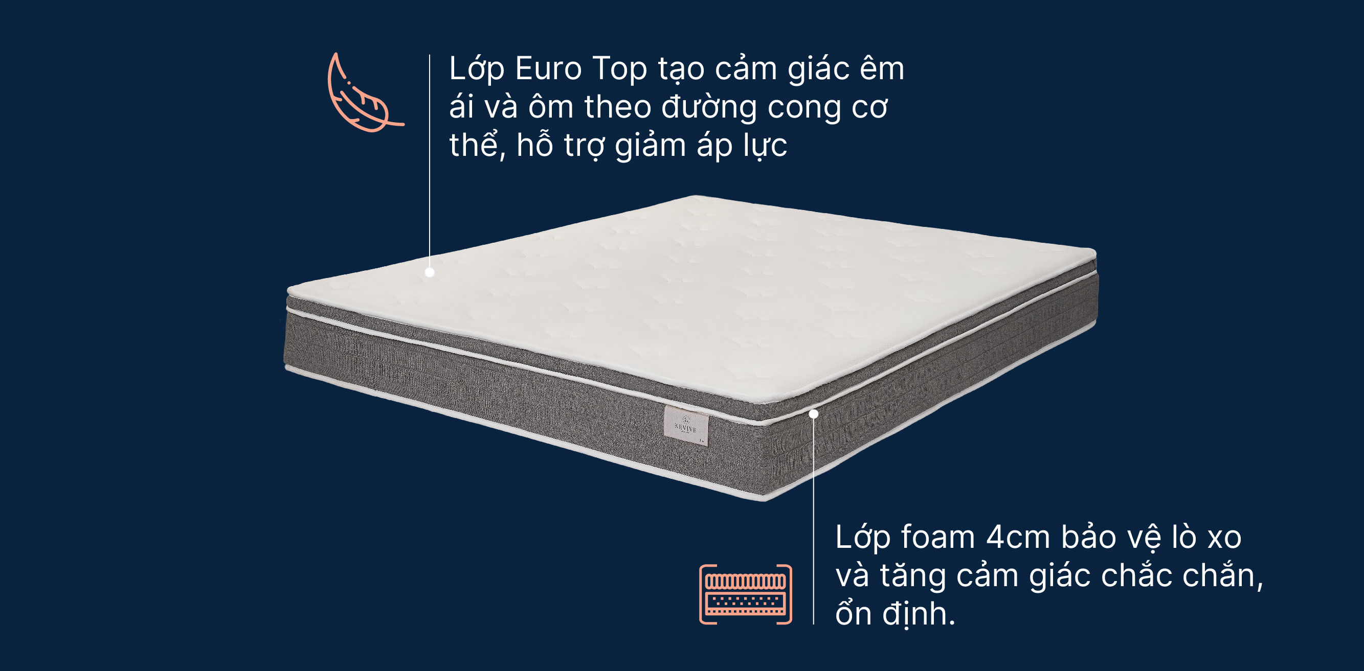 Lớp Euro Top nhiều lớp Foam được may trực tiếp dưới vải đệm, tạo cảm giác mềm mại, êm ái và ôm theo đường cong cơ thể hỗ trợ giảm áp lực.