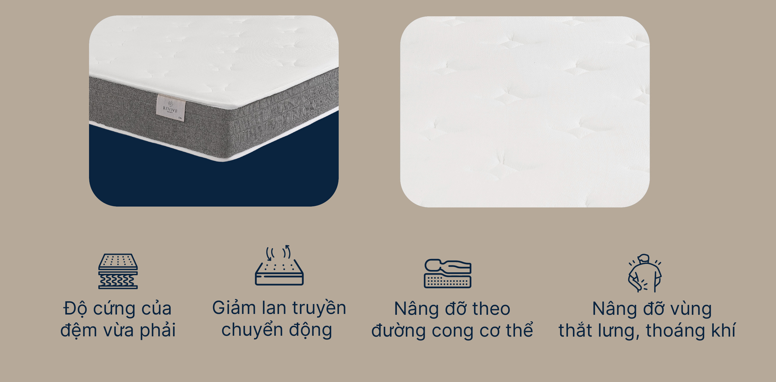 Hệ thống lò xo túi độc lập dạng thấp nâng đỡ tối ưu từng vùng cơ thể. Các cuộn lò xo được bọc trong túi vải riêng biệt hạn chế tối đa tiếng động va chạm giữa các thanh lò xo.