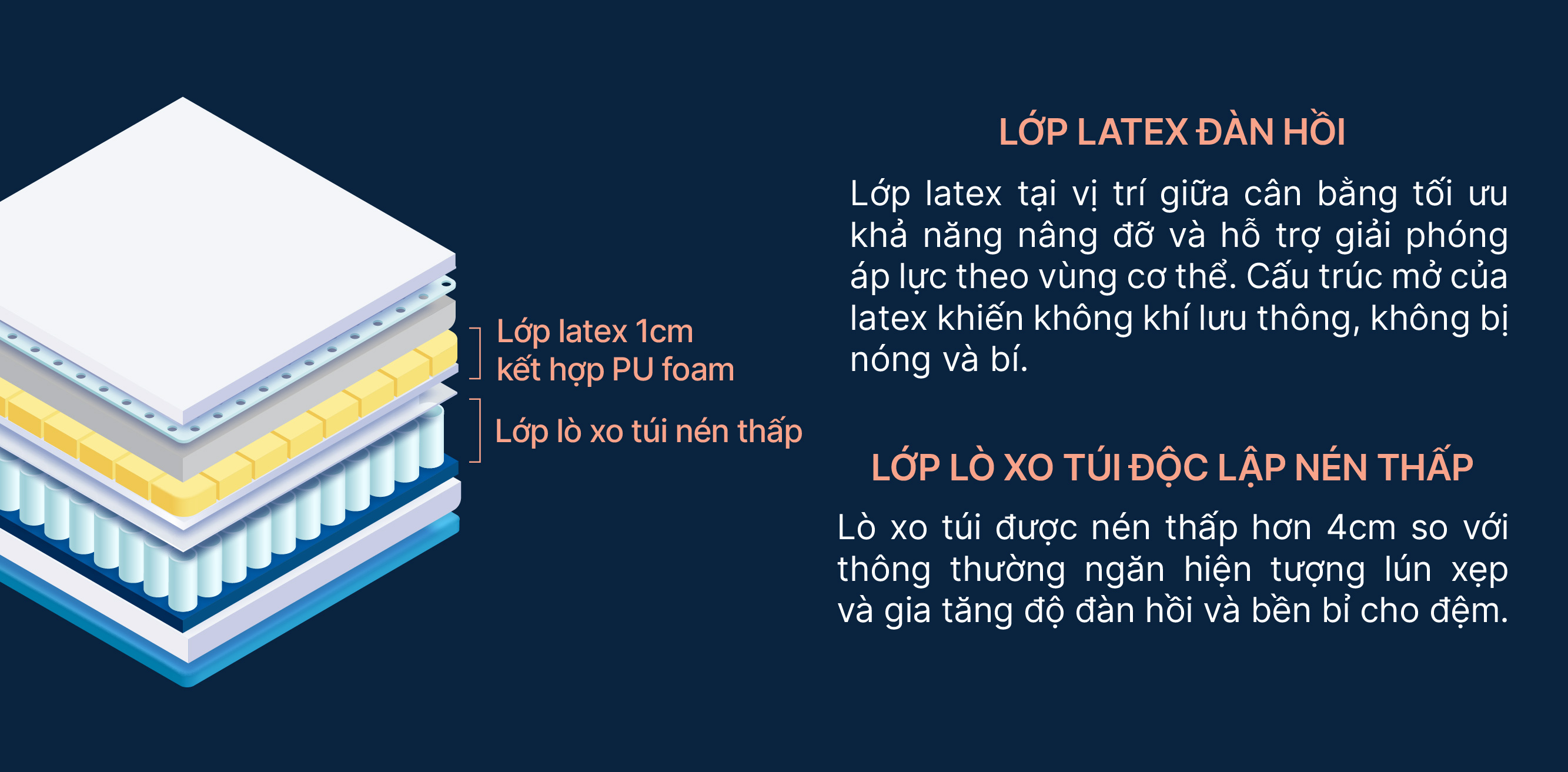 Lớp latex giúp cân bằng tối ưu khả năng nâng đỡ và hỗ trợ giải phóng áp lực theo vùng cơ thể. Cấu trúc mở của latex khiến không khí lưu thông, không bị nóng và bí.
